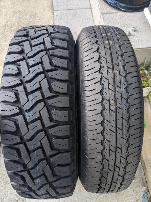 M/Tタイヤ:大きく深いブロックパターンと広いボイド(空間)で、泥や砂利をかき出す能力に優れます。ゴム硬度は高め(約65〜70度)で、岩場などでの耐久性を重視。ただし、この構造がオンロード走行時のロードノイズの主な原因となります。